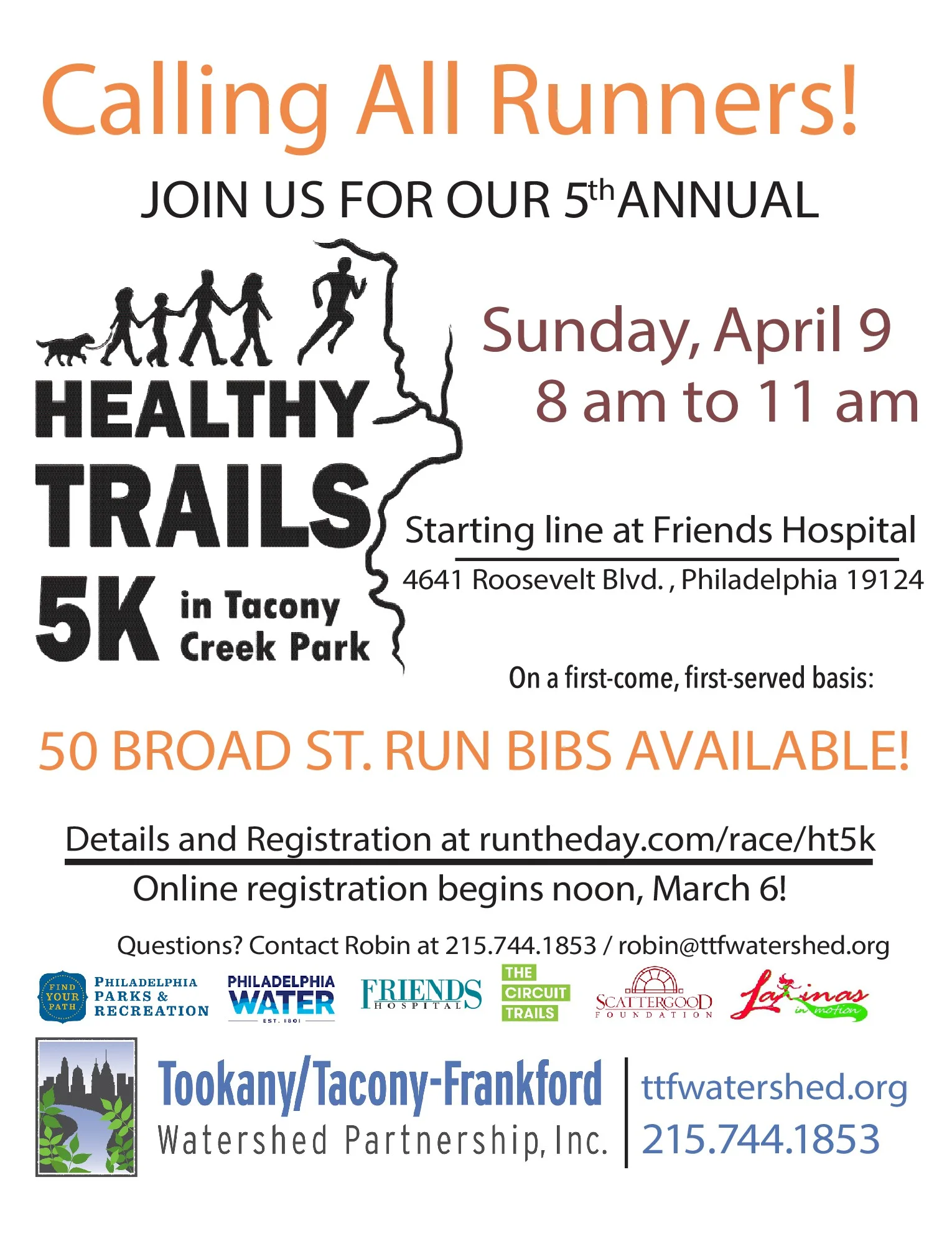 5k Run & Walk in Tacony Creek Park Saturday, April 15, 2017 8:00 AM 10:00 AM 08:00 10:00 friends hospital 4641 Roosevelt Boulevard Philadelphia, PA, 19124 United States (map) Google Calendar ICS