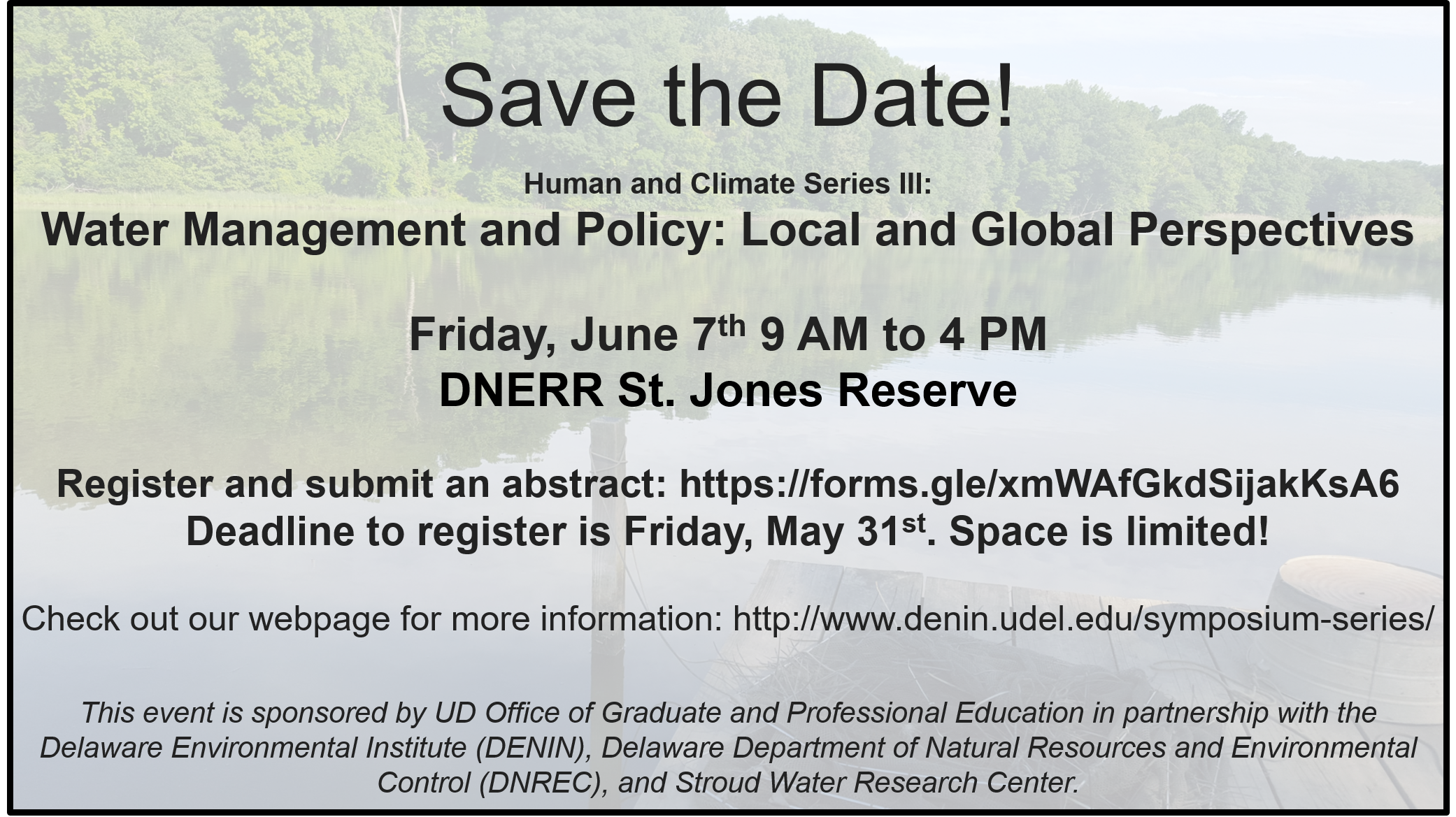 The third and final Human and Climate Series symposium is here! The FREE symposium is title "Water Management and Policy: Local and Global Perspectives" and will be held on Friday, June 7th, 2019 from 9 AM to 4 PM at the DNERR St. Jones Reserve (818 Kitts Hummock Rd, Dover, DE 19901).
