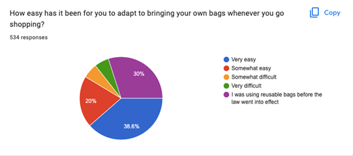 It is looking pretty positive! The majority of people support the Plastic Pollution Reduction Law. In addition, most people seem to be finding the shift to reusable grocery bags fairly easy. In fact, more than a third of respondents were already using reusable bags before the law went into effect!